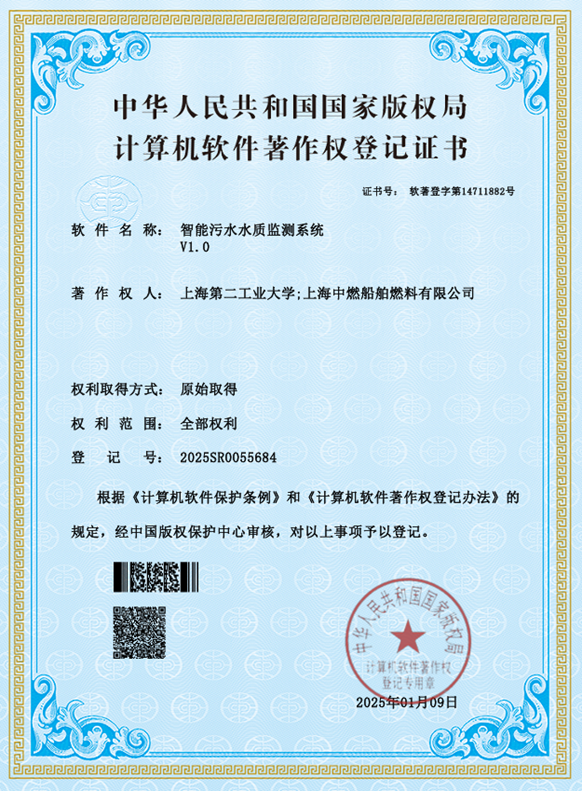 近日,上海中燃与上海第二工业大学合作开发的智能污水水质监测系统V1.0,荣获国家版权局颁发的计算机软件著作权登记证书。这一创新成果标志着双方在环保科技领域的合作上取得了重要突破。